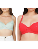 Ksvry Combo Pack of Two Women's Double Padded Bra With Half Net Lace Sky Blue and Red Color a perfect blend of comfort, support, and style. Featuring double padding for added lift, a chic ring detail, and delicate net lace for a feminine touch. Ideal for everyday wear or special occasions.